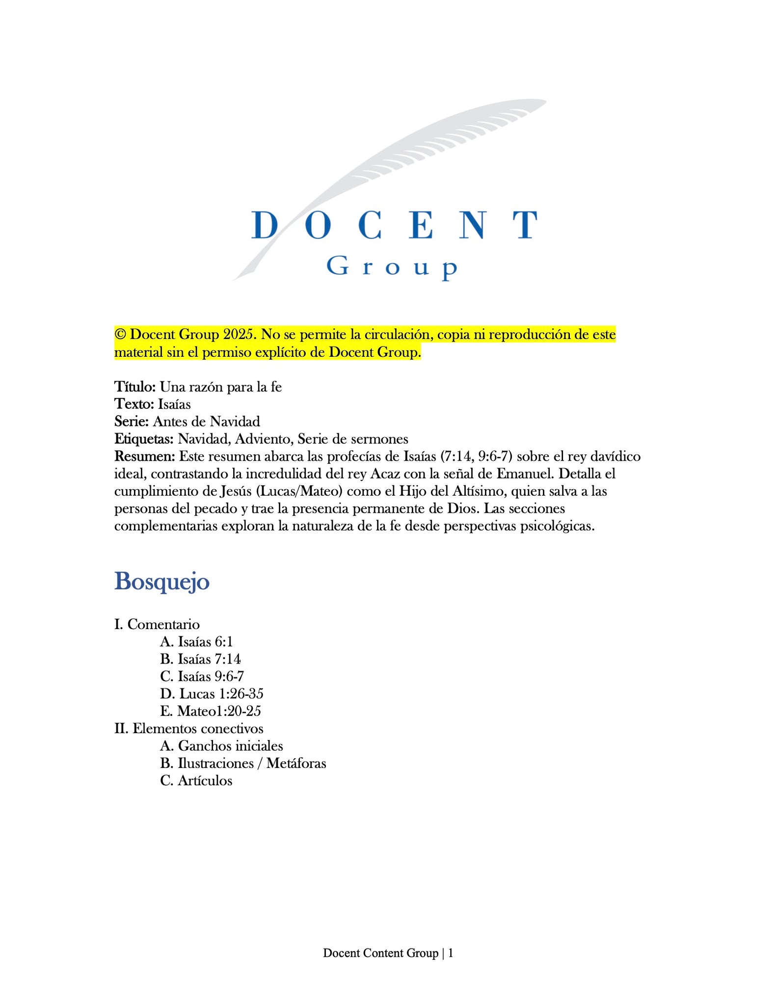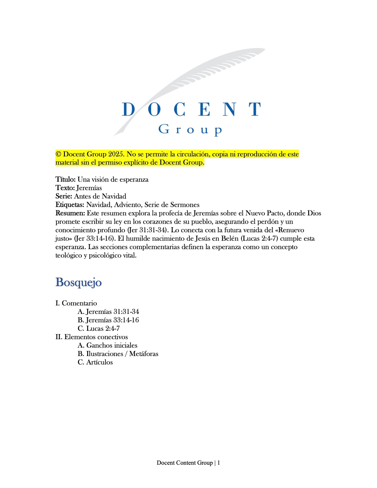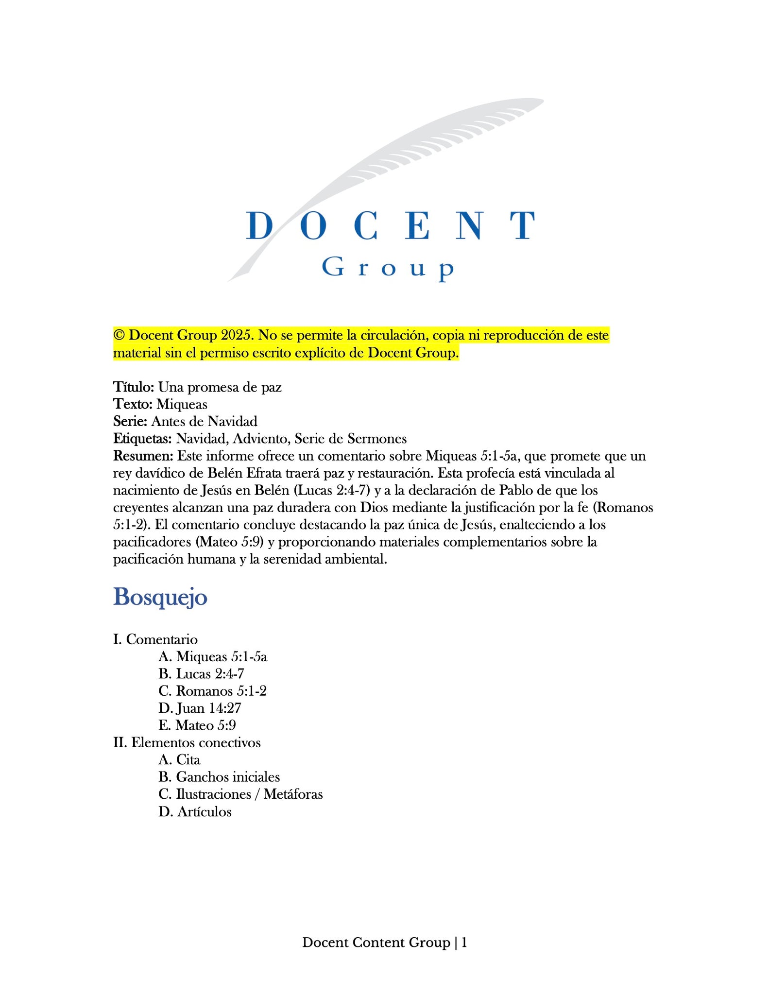 Un conjunto de cinco resúmenes de investigación para sermones para una serie navideña (49 páginas en total). Los resúmenes exploran las promesas bíblicas y el cumplimiento del nacimiento de Cristo, enfatizando temas de paz, fe, esperanza y amor. Destacan las profecías bíblicas que anticipan al Rey Davídico, el Príncipe de Paz, nacido en la humilde Belén para traer restauración a todas las naciones. Jesús —Emanuel, Dios con nosotros— trae la salvación del pecado y establece un Nuevo Pacto. Su venida, preparada por un precursor como Juan el Bautista, demuestra el amor de Dios y otorga a sus seguidores la paz con Dios.